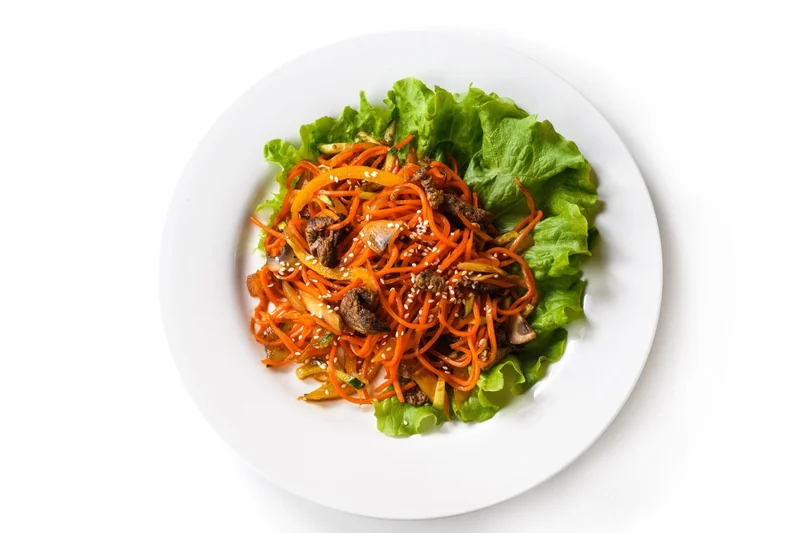 Салат с шампиньонами и корейской морковью Сочная маринованная по-корейски морковь с шампиньонами - простая, но очень аппетитная закуска, которая украсит стол и в праздники, и в будни Еда и рецепты 32 470