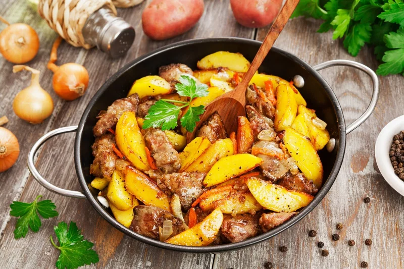 Жареное мясо с картофелем Запечённая картошка с жареным мясом, луком и чесноком - по мотивам грузинского блюда оджахури. Еда и рецепты 32 672