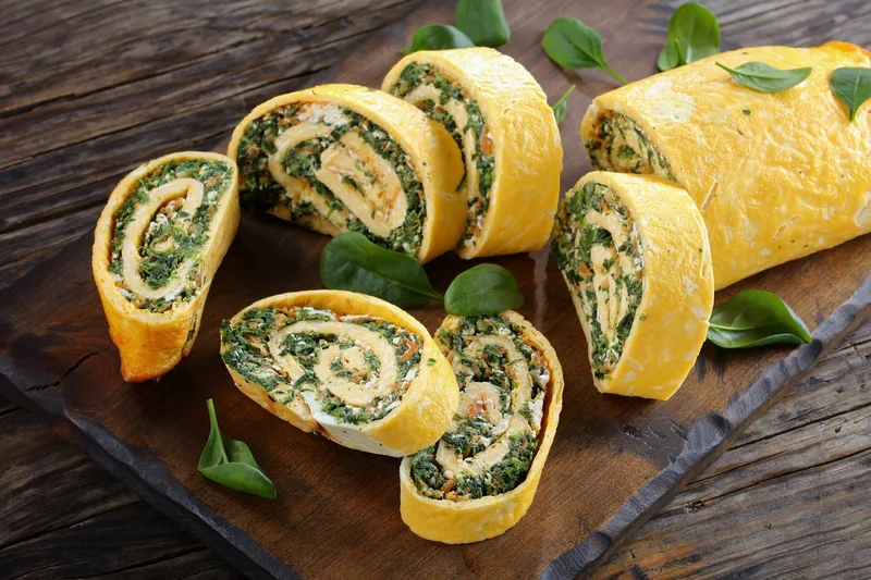 Рулет из индейки со шпинатом и омлетом Простой в приготовлении, вкусный и полезный вариант мясной закуски из индюшиного филе с омлетом, шпинатом и шариками моцареллы внутри. Еда и рецепты 14 579